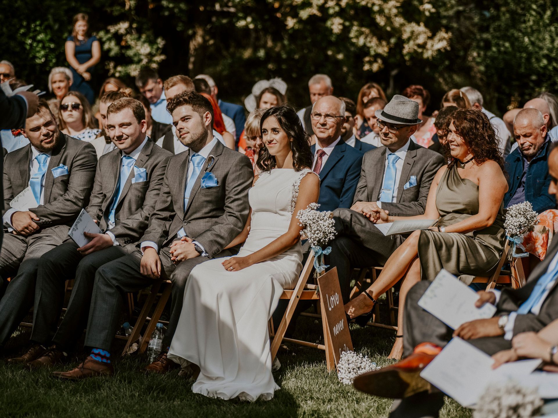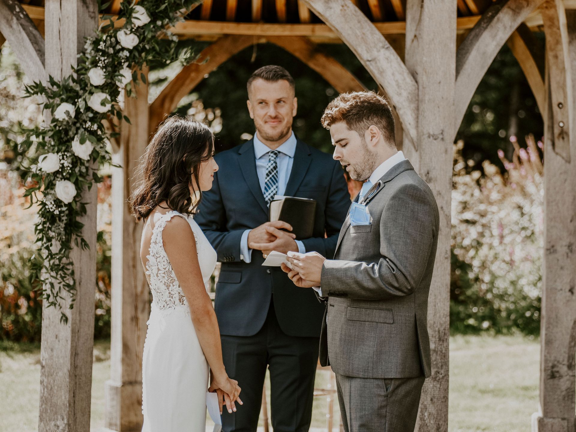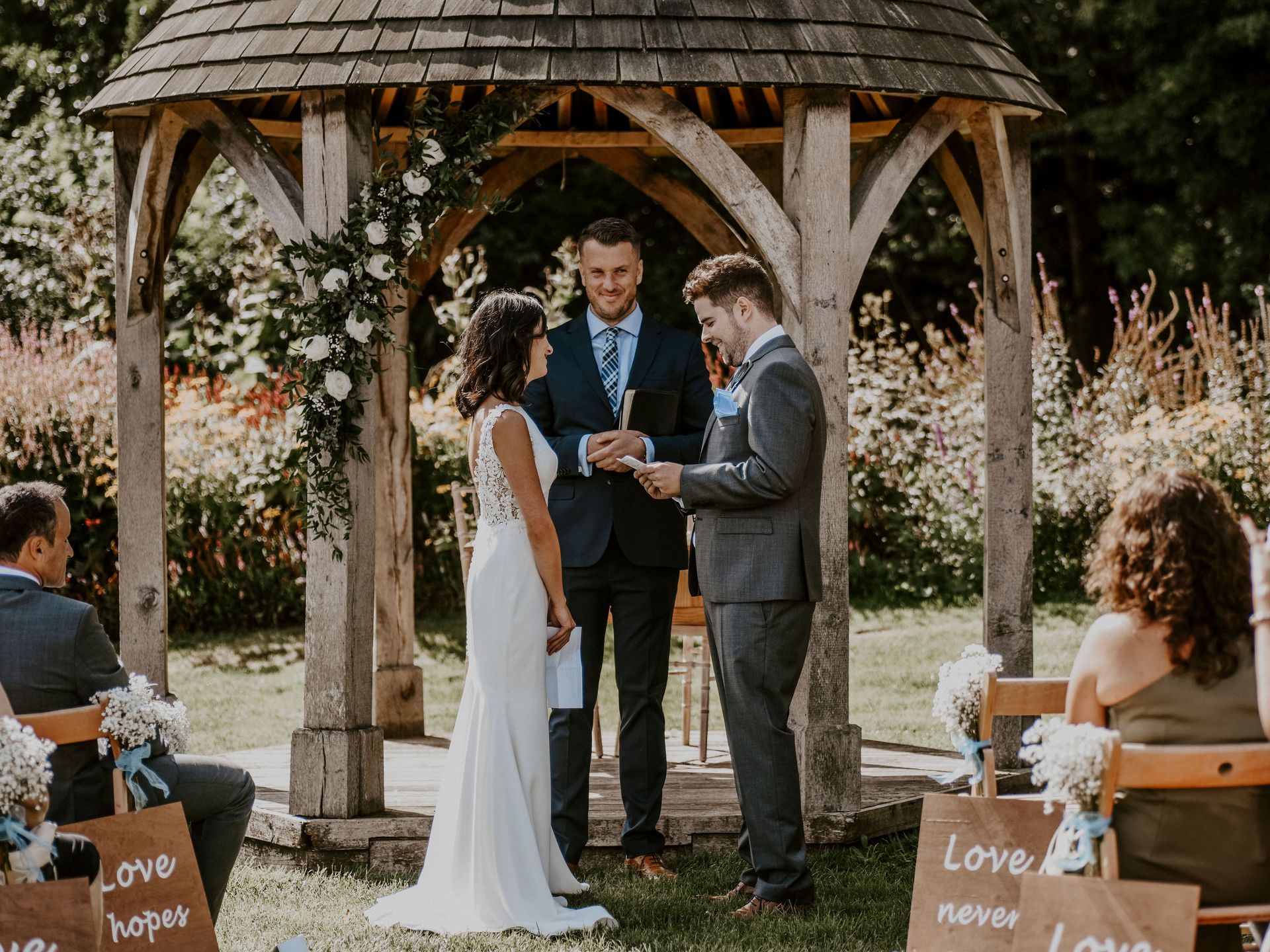 Our photographer is a friend of mine, Flora Westbrook, I was thrilled when she said she could photograph our wedding. She is amazing, so kind and talented. My gorgeous dress is a Paloma Blanca. I purchased it from a boutique shop in Keynsham called Lace & Grace. They are so lovely and helped me find a dress I loved in my short time frame. The band, The Vinyls, were absolutely fantastic and worked well with the style of the venue. They got the dance floor filled from the moment they started playing. Josh' friend Ethan runs a graphic design business called New Rhythm and he kindly did our stationary for us, totally bespoke and beautiful we were so happy with each tiny detail. We had a three-tiered chocolate cake with delicious white chocolate icing and Lego toppers! Sam from CakeCakeCake made it for us, our friends still rave about how amazing it was.